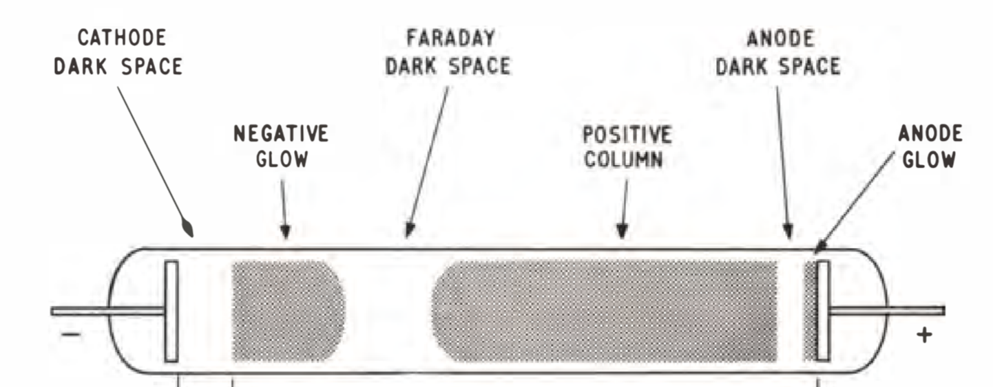 5 Sometimes, the negative glow is shown sticking onto the cathode. In other times, we have two dark spaces with three regions of emission from the cathode side (before the Faraday dark space). The geometries of emission can be quite sensitive, so we will assume the “negative glow” is sticked/sheathed onto the cathode.