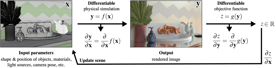 If \(f\approx C\) 14, we can minimize the difference between the two images via optimization to find the optimal scene description \(\theta\) that best estimates \(\phi\), where \({\arg\min}_\theta I-I'={\arg\min}_\theta f(\theta)-C(\phi)\). This requires differentiating the rendering process with respect to \(\theta\), allowing us to piggy-back on years of development on tools developed from forward physically-plausible rendering into inverse rendering.